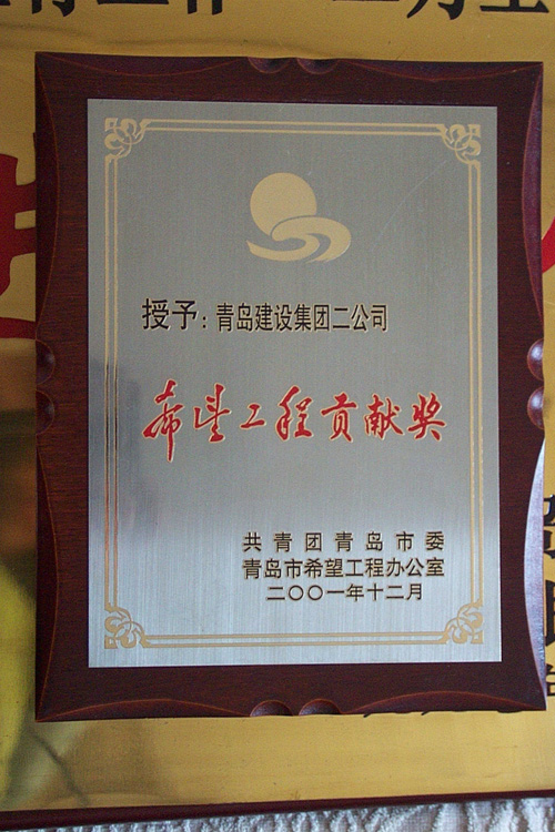 2001年為希望工程捐款20萬元,援助西部貧困山區(qū)建設希望學校,被團市委、青島市希望工程辦公室授予“希望工程貢獻獎”