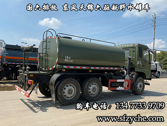 國六排放潤知星牌SCS5165GPSDFV6型六驅(qū)越野綠化噴灑車_東風天錦六驅(qū)森林消防水罐車_六驅(qū)園林綠化灑水車主要用于城鄉(xiāng)園林綠化灑水,噴藥等;主要裝置為水罐及泵.隨底盤選裝駕駛室.罐體有效容積8.7立方米.罐體外形尺寸(長×長軸×短軸)(mm) 4200×2350×1300.側(cè)、后防護材料為Q235B,側(cè)、后防護與車架焊接連接.后部防護裝置斷面尺寸(寬×高)50×120(mm),后部防護離地高度:460mm.ABS型號/生產(chǎn)廠家:3631010-C2000/東科克諾爾商用車制動系統(tǒng)(十堰)有限公司。東風天錦六驅(qū)越野綠化灑水車上裝配置:罐體采用優(yōu)質(zhì)碳鋼QB235板材,板材厚度4mm,罐體容積8.7立方,安裝取力器,60-90威龍大功率水泵可泵進泵出,后置工作平臺帶水炮射程25米,消防栓接口左右各一個,選裝駕駛室頂部安裝長條警燈帶喊話器,全車顏色軍綠,兩側(cè)噴涂白色森林消防字樣等。