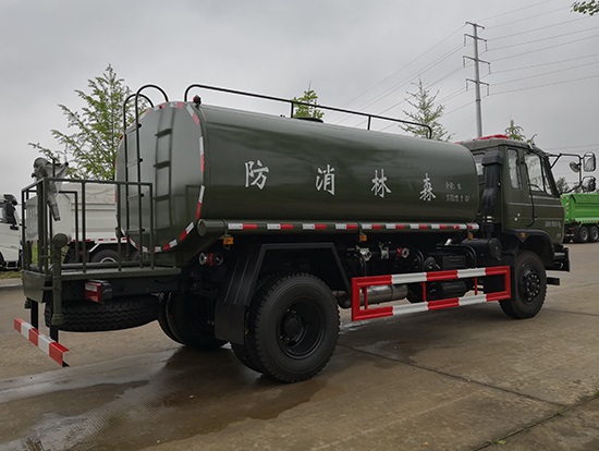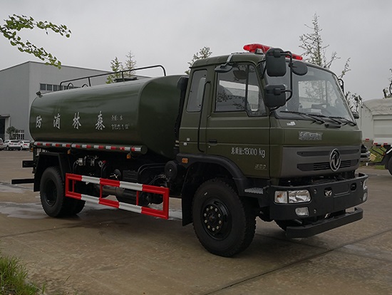 采用東風EQ2180GD5DJ型越野汽車底盤,東風一排半寬體駕駛室,4×4驅動,康明斯ISB190 50國五發(fā)動機,六檔變速箱,東風商用車橋,前驅動橋3.8噸,后橋10噸,10.00R20輪胎,軸距4500mm,電動玻璃,方向助力,斷氣剎,ABS。罐體采用優(yōu)質碳鋼QB235板材,板材厚度4mm,罐體容積11.1立方,變速箱安裝取力器,大功率水泵可泵進泵出,后置工作平臺帶水炮射程25米,消防栓接口左右各一個,選裝駕駛室頂部安裝長條警燈帶喊話器,全車顏色軍綠,兩側噴涂白色森林消防字樣。
