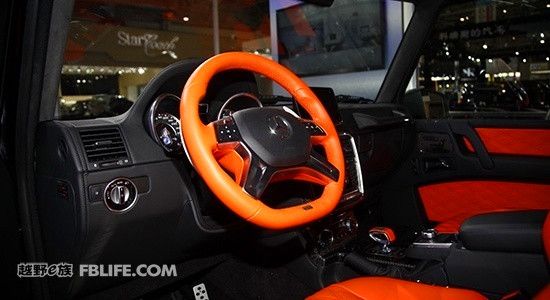 北京車展上的基于G63 AMG 6×6改裝而來的BRABUS 版700G 6 X 6 內(nèi)飾方面,該車采用了黑色和橘黃色的顏色搭配,強烈的顏色反差構造出不錯的視覺效果。四幅式真皮方向盤外圈也采用橘黃色真皮包裹,搭配顏色裝飾條,視覺效果極佳。擋把的設計類似于飛機操作感,上面印有巴博斯的標志,非常具有設計感。