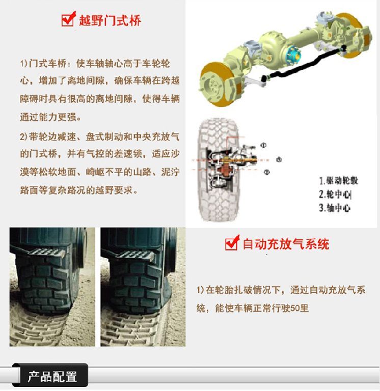 最大爬坡度:≥60% 前后車(chē)橋:帶輪邊減速、盤(pán)式制動(dòng)器門(mén)式橋,并有氣動(dòng)控制的差速鎖