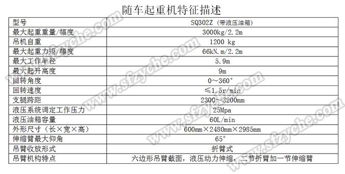 凈功率206kw; 起重機(jī)型號為:SQ302Z(帶液壓油箱),起重機(jī)質(zhì)量為:1200kg,最大額定超升載荷為:3000kg. 側(cè)防護(hù)金屬材料Q235斷面槽形,螺栓連接,斷面高度40mm,離地高度450mm; 后防護(hù)金屬材料Q235斷面槽形,螺栓連接,斷面高度135mm,離地高度500mm; 安裝具有衛(wèi)星定位功能行駛記錄儀,東風(fēng)越野隨車吊:www.ingloriousdogs.com 吊機(jī)詳細(xì)參數(shù):
