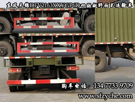 東風(fēng)天錦四驅(qū)越野廂式運(yùn)輸車(chē)(國(guó)六排放)可以上牌了!東風(fēng)牌DFV2163XXYGP6D型四驅(qū)越野廂式運(yùn)輸車(chē):整車(chē)外形尺寸長(zhǎng)寬高7760,7960X2500,2550X3380,3580(mm)、廂體內(nèi)部尺寸長(zhǎng)寬高5400,5600X2400,2450X1900,2100(mm);廂體選裝瓦楞板設(shè)計(jì),底板4mm花紋板,后對(duì)開(kāi)門(mén),側(cè)單開(kāi)門(mén)。適用于山區(qū)道路、戈壁灘道路的物資運(yùn)輸。