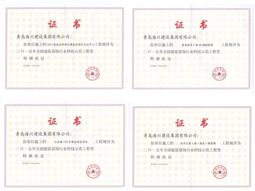 近日,海川集團(tuán)從中國(guó)建筑裝飾協(xié)會(huì)捧回4項(xiàng)全國(guó)建筑裝飾行業(yè)“科技示范工程”和4項(xiàng)“科技創(chuàng)新成果”的證書和獎(jiǎng)牌。分別為: