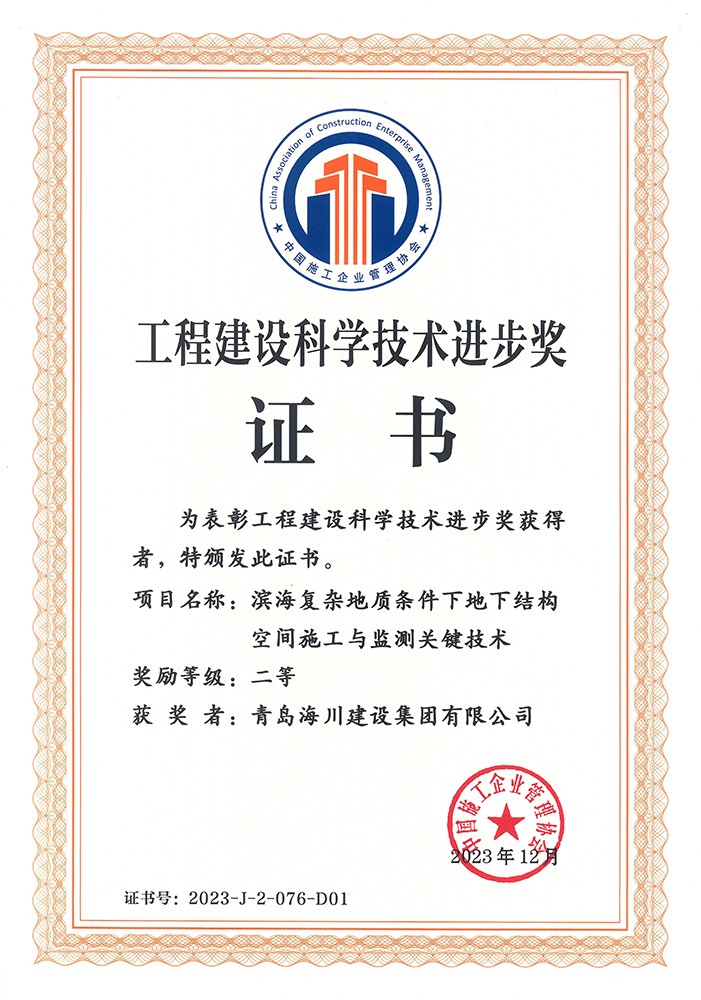 近日,集團(tuán)公司從中國施工企業(yè)管理協(xié)會(huì)領(lǐng)回了2023年工程建設(shè)科學(xué)技術(shù)獎(jiǎng)成果證書兩項(xiàng),根據(jù)《工程建設(shè)科學(xué)技術(shù)獎(jiǎng)評選辦法(2021年修訂稿)》的規(guī)定,經(jīng)科委辦公室形審、專家網(wǎng)評、科委專家委員會(huì)評審、科學(xué)技術(shù)委員會(huì)審定和公示,以及會(huì)長會(huì)議批準(zhǔn),由海川建設(shè)主持的課題《濱海復(fù)雜地質(zhì)條件下地下結(jié)構(gòu)空間施工與監(jiān)測關(guān)鍵技術(shù)》以及聯(lián)合申報(bào)課題《青島國際院士產(chǎn)業(yè)核心區(qū)先導(dǎo)區(qū)(生物醫(yī)藥區(qū))項(xiàng)目》均獲得了科技進(jìn)步獎(jiǎng)二等獎(jiǎng),本次獲獎(jiǎng),是企業(yè)首次以第一完成單位獲得的國家級(jí)社會(huì)力量科學(xué)技術(shù)獎(jiǎng),對于推動(dòng)企業(yè)技術(shù)創(chuàng)新具有重大意義。
