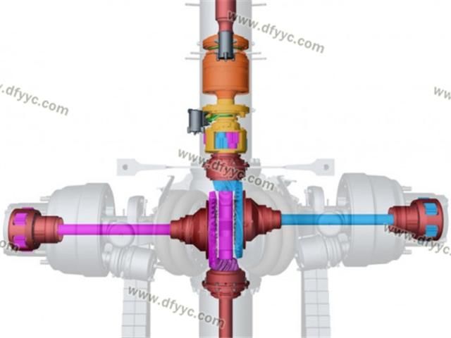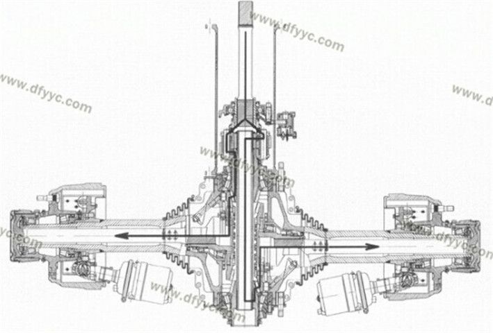 另外,這種斷開式車橋的輪間差速器并不在橋包中,而是被轉(zhuǎn)移到了脊柱套管了,左右側(cè)車輪分別由兩套錐齒輪驅(qū)動,為了讓這兩套錐齒輪互不干涉,其左右半軸在縱向錯開了一定的距離,也就是說它的兩個半軸并不在一個平面內(nèi)。類似的設(shè)計手法裝載機(4X4軸轉(zhuǎn)向的裝載機)上也有使用,還有采用錯開一定角度的做法來避免左右錐齒輪互相干涉的情況。